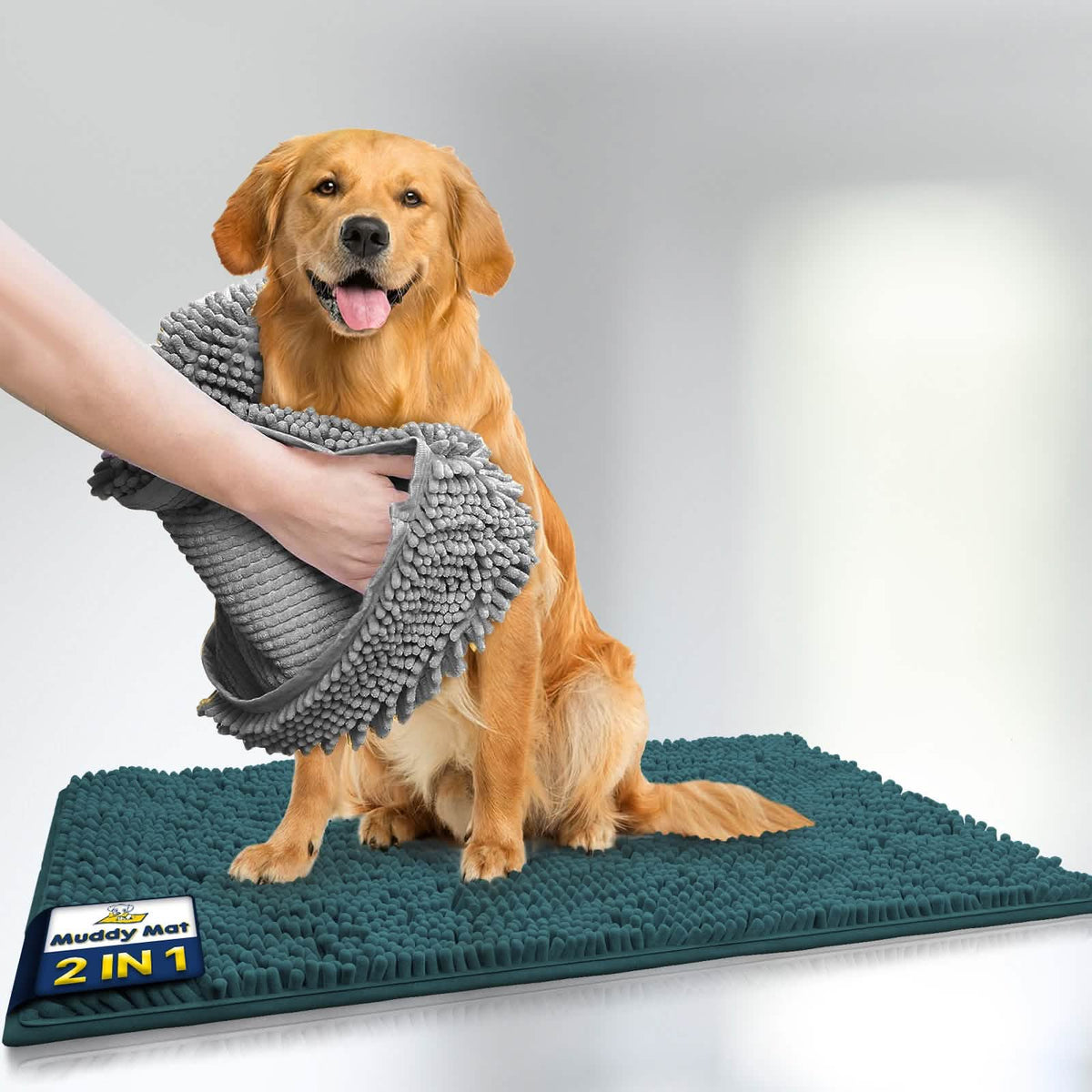 Muddy Mat® helps tackle muddy paws and soggy coats with a super absorbent chenille door mat that traps dirt and moisture at the entryway, paired with the ultra-soft Doggy Dryer microfiber shammy towel that quickly dries pets of all sizes. Both are machine washable, durable, and perfect for keeping floors clean and pets comfortable.
