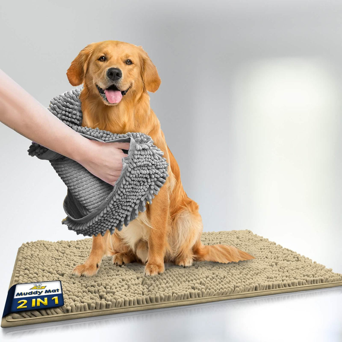 Muddy Mat® helps tackle muddy paws and soggy coats with a super absorbent chenille door mat that traps dirt and moisture at the entryway, paired with the ultra-soft Doggy Dryer microfiber shammy towel that quickly dries pets of all sizes. Both are machine washable, durable, and perfect for keeping floors clean and pets comfortable.