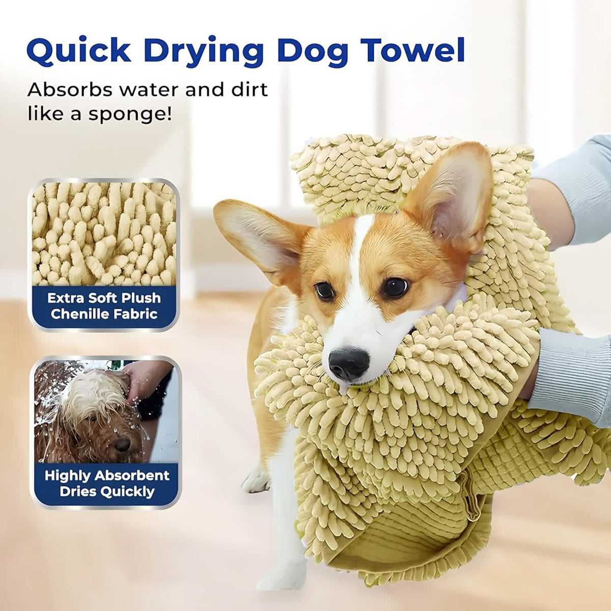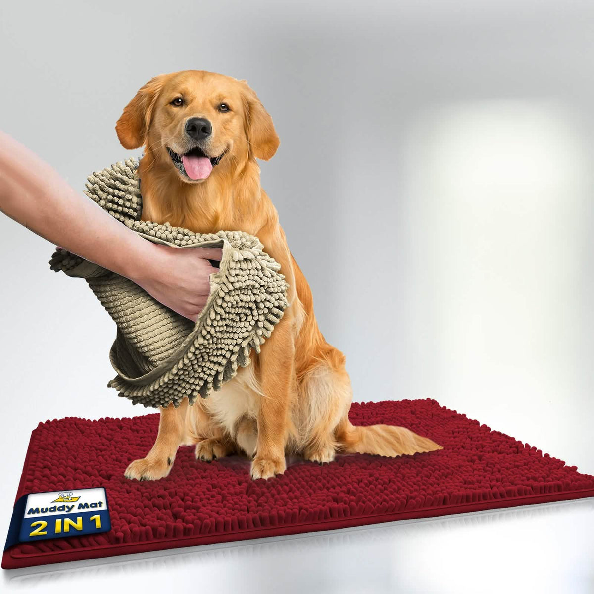 Muddy Mat® helps tackle muddy paws and soggy coats with a super absorbent chenille door mat that traps dirt and moisture at the entryway, paired with the ultra-soft Doggy Dryer microfiber shammy towel that quickly dries pets of all sizes. Both are machine washable, durable, and perfect for keeping floors clean and pets comfortable.